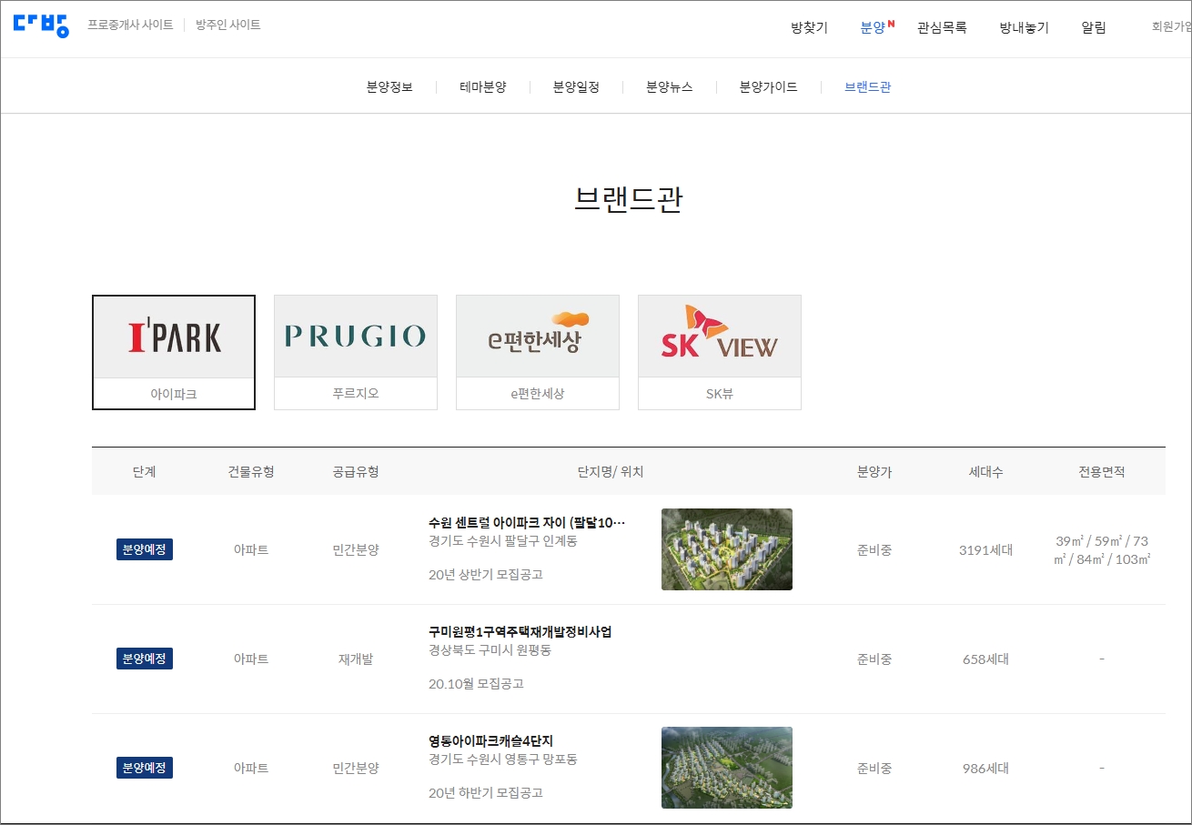 아파트 브랜드를 중요하게 생각하는 분들을 위해서 분양 - 브랜드관 메뉴도 있습니다. 크게 아이파크와 푸르지오 이편한세상 SK 뷰가 있네요. 대한민국의 대표적인 아파트 브랜드들로 각각의 브랜드에는 장단점이 있다보니, 이렇게 브랜드관을 통해서 분양정보를 알아보는 분들도 많을거라 생각합니다.