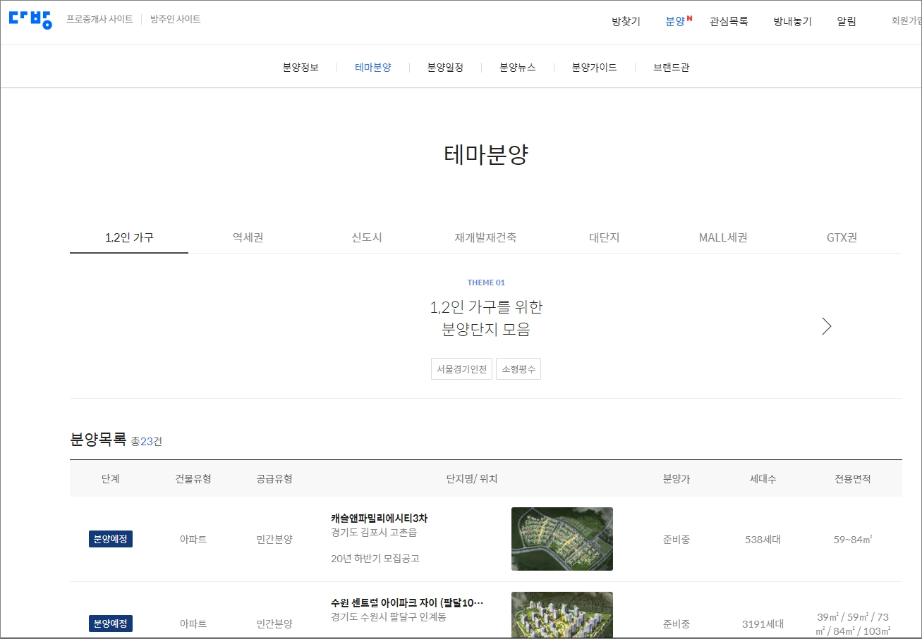 1,2인 가구를 위한 분양단지 모음등 특별한 테마를 갖고 분양하는 것들을 선별적으로 찾아볼 수 있습니다. 편하게 출퇴근하기위한 역세권 분양, 서울과 가까운 신도시 아파트 분양, 재개발 재건축등등 다양한 테마에 맞게 목록이 구분되어 있어서 아! 이런 지역도 있구나 하는 공부까지 겸하게 되는 메뉴입니다.