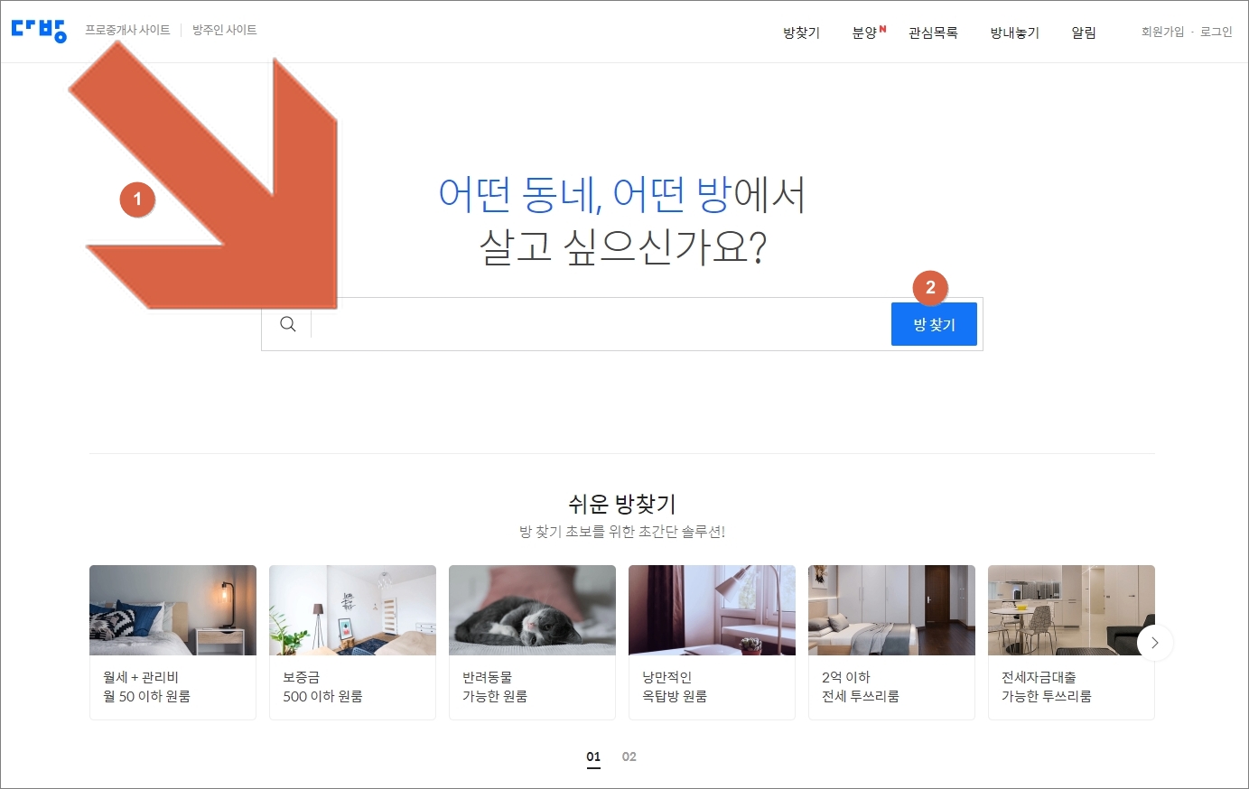 2번에서 만난 다방의 첫번째 화면에서 화면 상단에 보면 '방찾기'라는 메뉴를 찾을 수 있습니다. 검색창에 검색어를 입력하지 마시고, 최상단 메뉴에서 방찾기를 클릭해주세요.