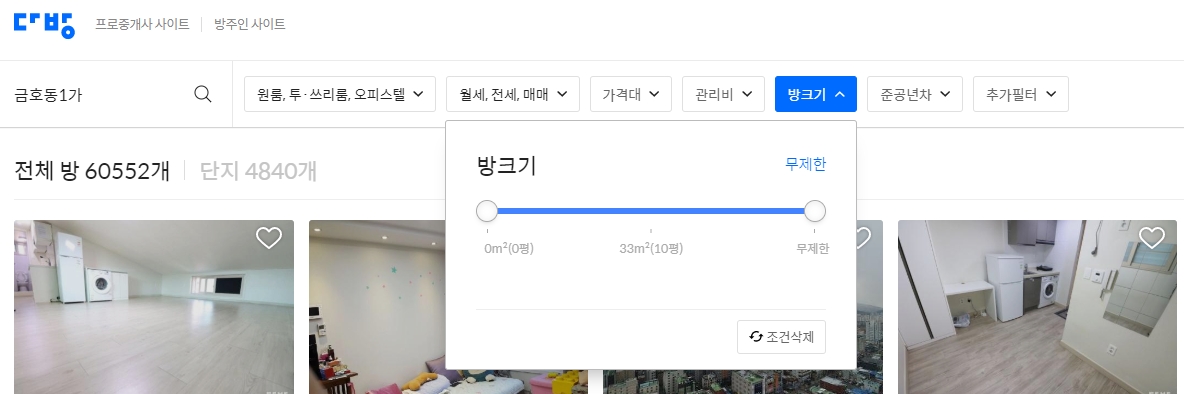 다방 홈페이지 바로가기를 통해 접속한 서비스에서는 다양한 방찾기 검색 옵션을 제공합니다. 상단에 방찾기를 접근한 후 바로 아래 라인을 살펴보면 가장 왼쪽에는 현재 지도에 가까운 지역명이 표기되어있고, 오른쪽에 크게 7가지의 필터 옵션이 존재합니다.
