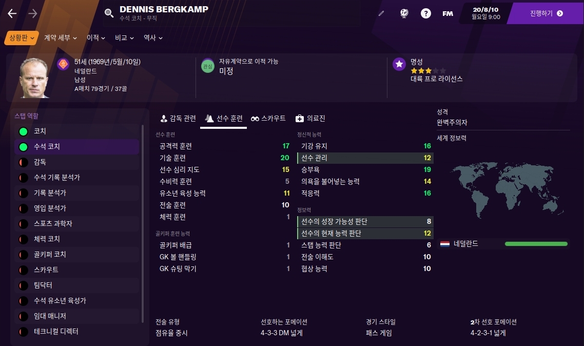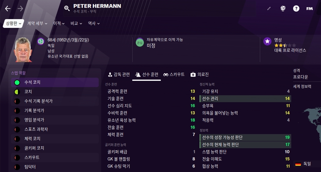 풋볼매니저에서 감독과 함께 가장 큰 역할을 하는 스탭중 한명입니다. 그만큼 아주 잘 선택해야 하죠. 위의 리스트에 있는 사람들을 수석코치로 영입하면 후회 없을 것 입니다. 수석코치는 선수관리, 선수의 현재능력판단, 의욕을 불어넣는 능력, 승부욕, 기강유지등의 능력치가 중요한 것으로 알려져있습니다.