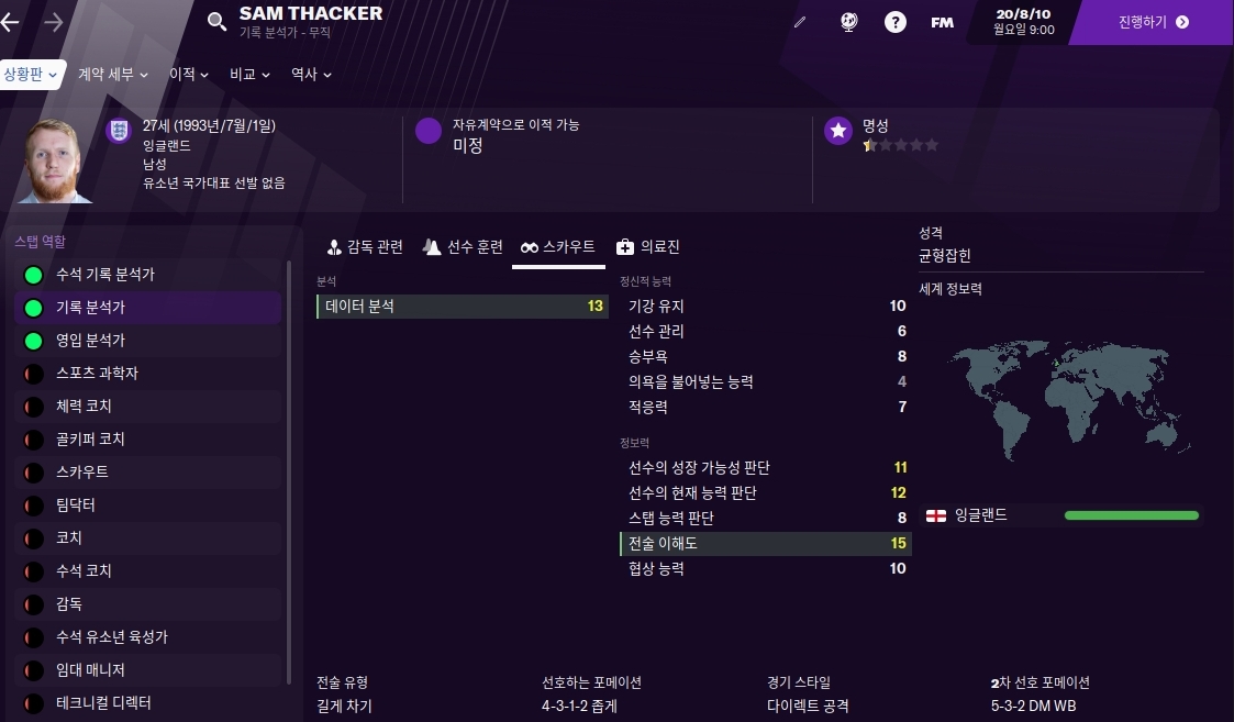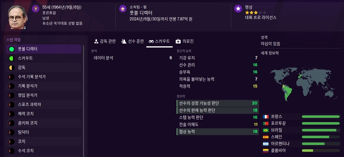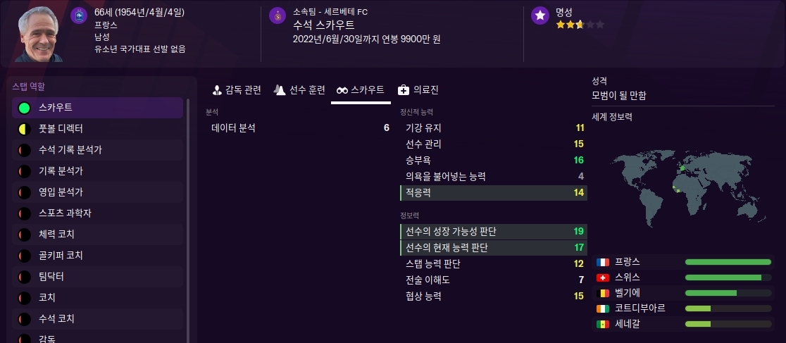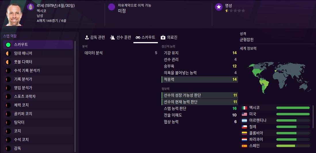 위 리스트에서 단 한명의 스카우트만 선수검색시 사용하기 위해서 높은 스탯으로 영입하고, 나머지 스카우트는 국가 정보력을 보고 영입합니다. 잉글랜드, 스페인, 이탈리아, 독일, 프랑스 리그의 정보력이 높은 스카우트가 좋습니다. 유럽리그의 가장 뛰어난 선수들이 뛰고있는 리그이기 때문입니다.
