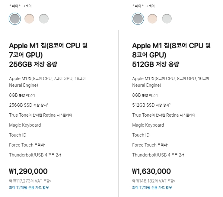 1,290,000원의 가격은 기본적인 8기가 256GB SSD모델입니다. 그러나 왼쪽모델과 오른쪽 모델은 약간의 차이점이 있습니다. 바로 GPU의 코어 차이인데요, CPU나 GPU에서의 코어는 마치 컴퓨터를 가동하는 공장1개라고 생각하면 됩니다. 왼쪽의 맥북에어 라인은 7코어 GPU, 오른쪽의 맥북에어 라인은 8코어 GPU를 탑재했기 때문에, 작은 차이지만 놓치지 말고 구매하는 것을 추천합니다.
