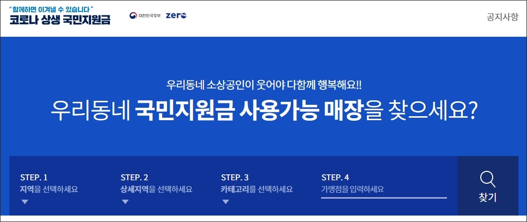 | 국민지원금 사용불가능 | 백화점과 복합쇼핑몰, 대형마트 및 기업형 슈퍼마켓, 면세점, 유흥업종 및 사행산업, 대형 전자판매점과 직영매장, 프랜차이즈 직영 매장 및 대형 외국계 매장, 대형 온라인몰, 홈쇼핑, 대형 배달앱 등 |